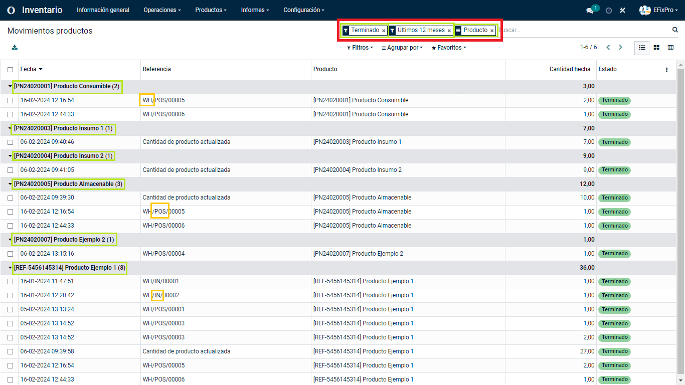 Dentro del módulo de inventario de Odoo, se destaca la capacidad de verificar los movimientos de productos, ya sea en traslados entre almacenes, compras, ventas u otras operaciones.