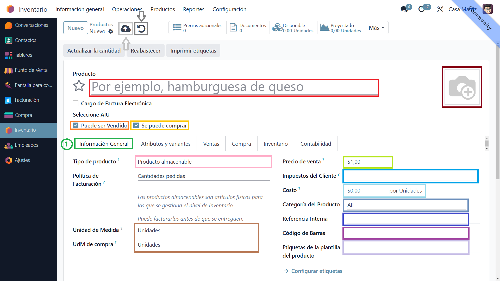 - Foto del Porducto: En la aprte superior derecha podremos agregar una foto al producto, oprimiendo en el boton con forma de "Lapiz".