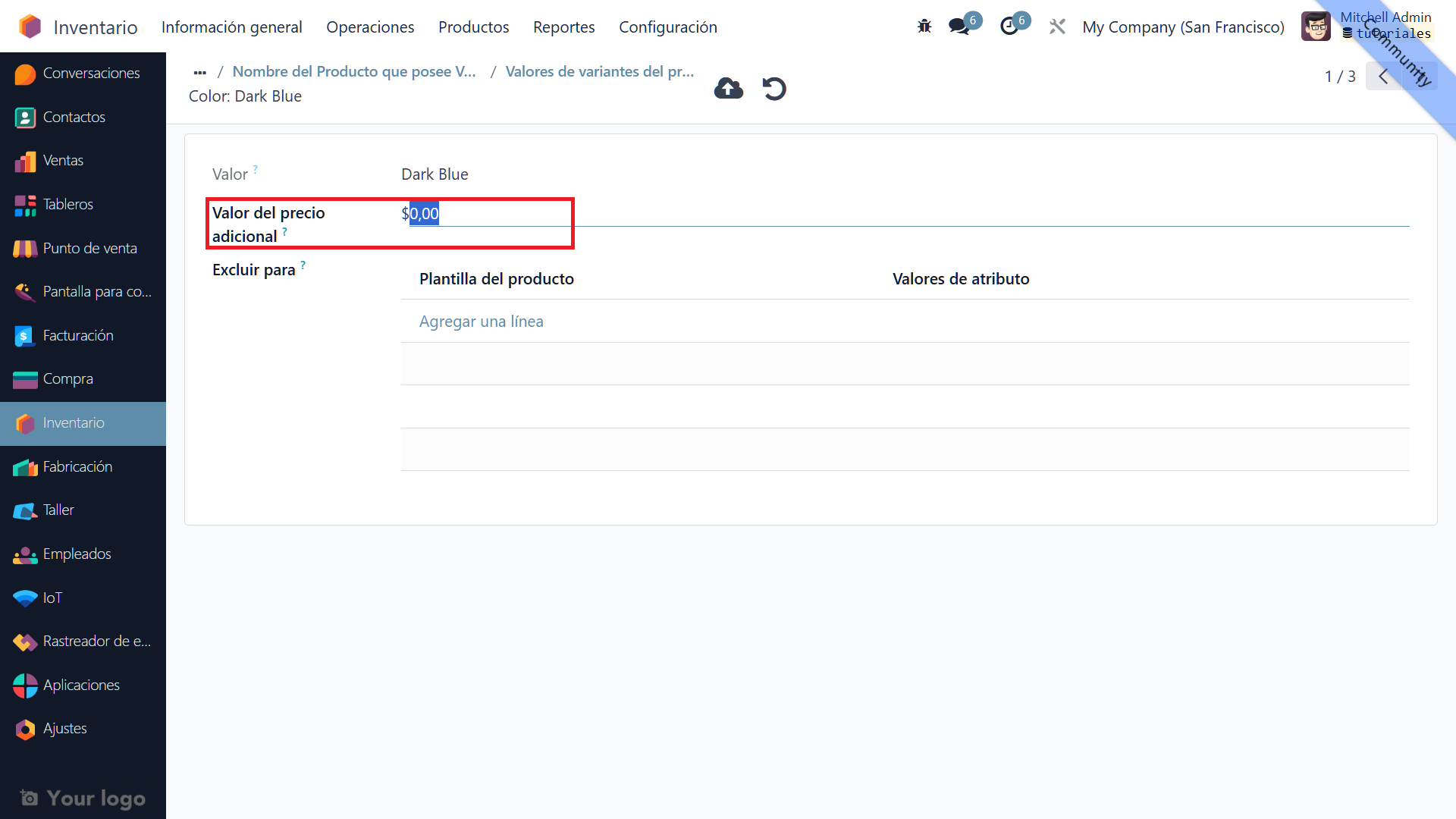 Para modificar el precio adicional de una variante, haz clic en uno de los valores agregados. Podrás ajustar el precio adicional según sea necesario.