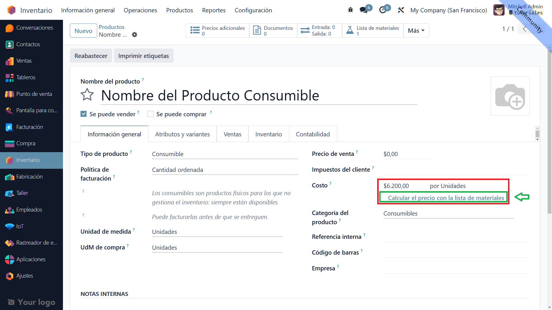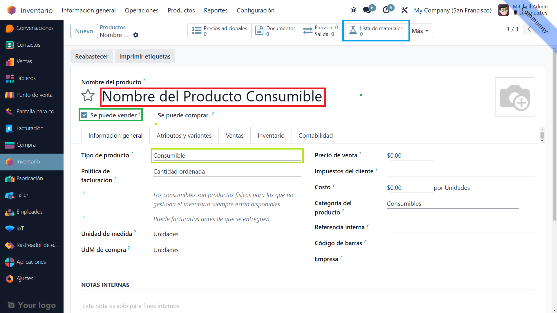 - Tipo de producto: Selecciona "Consumible".