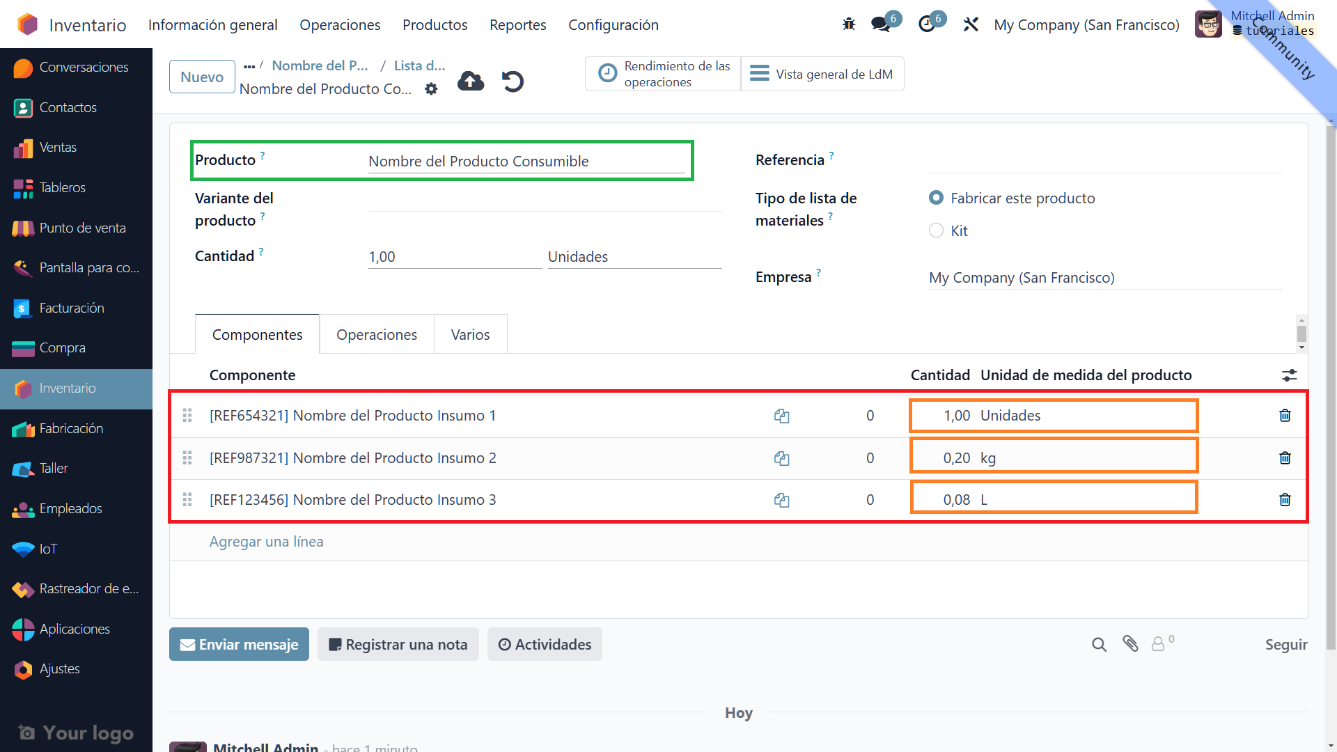 - Agregar líneas de productos componentes: Añade los componentes necesarios para fabricar el producto. Por ejemplo, para una "Pizza Margherita", los componentes podrían ser "Masa de pizza", "Salsa de tomate" y "Queso mozzarella".
